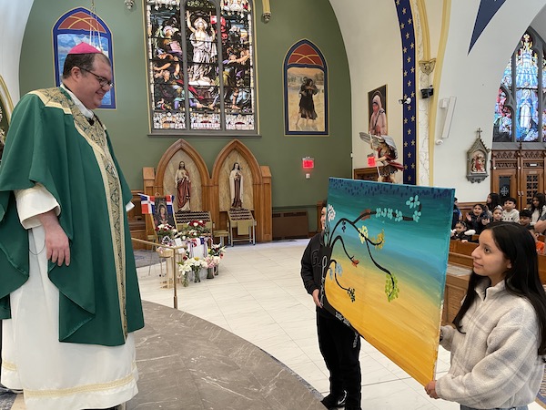 Denise Reicino, directora de la Our Lady of Sorrows Catholic Academy, no quiso que el obispo electo Rodríguez se marchara sin que los estudiantes tuvieran la oportunidad de despedirse y entregarle algunos obsequios.