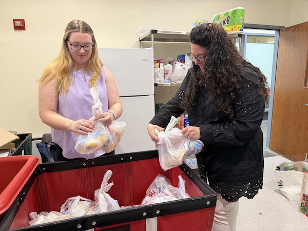 Gracias a las donaciones, el programa Vincent’s Table preparó bolsas con ingredientes para el desayuno para distribuir entre los estudiantes de la universidad y ayudarlos a sostenerse durante la Semana de Exámenes Finales. Crystal DiBenedetto (izquierda) y Mary-Elizabeth Sabo colocan las bolsas de desayuno en contenedores en preparación para la distribución. Sabo señaló que cada bolsa también incluye notas personalizadas deseando a los estudiantes buena suerte en sus exámenes. (Foto: Paula Katinas)